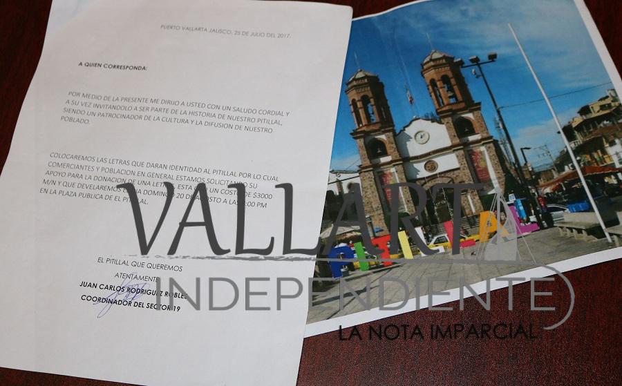 Colocaremos las letras que darán identidad al Pitillal, por lo cual, comerciantes y población en general estamos solicitando su apoyo para la donación de unas letras, esta con un costo de $3000 m/n y que develaremos el día domingo 20 de agosto a las 8:00 pm en la plaza pública de El Pitillal”, cita íntegramente el oficio.