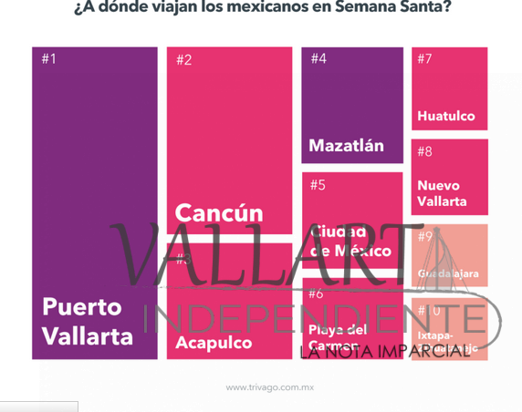 Después del destino de playa más importante de Jalisco; le sigue Cancún, Quintana Roo, y Acapulco, Guerrero; mientras que los siguientes lugares son para la Ciudad de México, Playa del Carmen, Quintana Roo; Huatulco, Oaxaca; Nuevo Vallarta, Nayarit, Guadalajara, Jalisco, así como Ixtapa-Zihuatanejo, Guerrero.