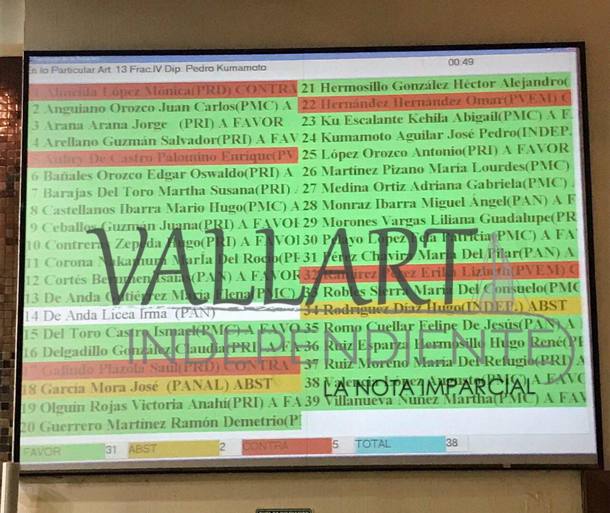 En la tabla podemos apreciar que los diputados del Partido Verde Ecologista de México votaron en contra de la iniciativa, así como el candidato del PRD Saúl Galindo Plazola, plurinominal del distrito 5.