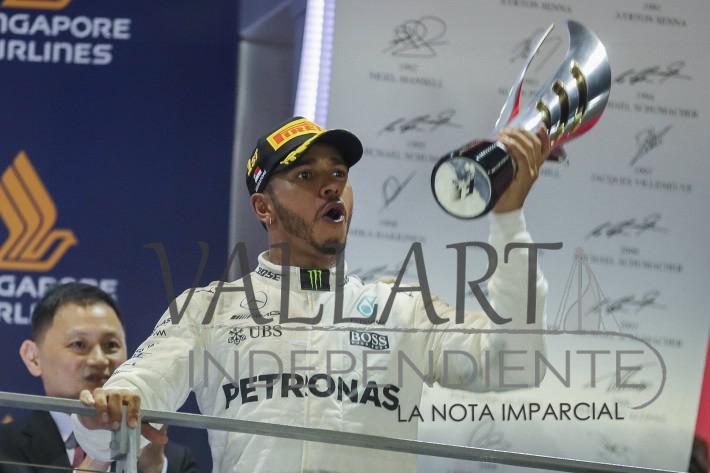 Por: Redacción Vallarta Independiente. Lewis Hamilton se benefició del caos en el comienzo del Gran Premio de Singapur el domingo para aumentar su ventaja en la tabla general a 28 puntos sobre Sebastian Vettel, quien perdió mucho terreno tras estrellarse en la primera vuelta. El mexicano Sergio Pérez terminó en quinto lugar con su Force India, escudería con la que renovó contrato.