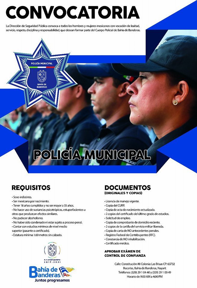 Dicha convocatoria invita a todos los hombres y mujeres mexicanos con vocación de lealtad, servicio, respeto, disciplina y responsabilidad, que deseen formar parte del Cuerpo Policial de Bahía de Banderas.