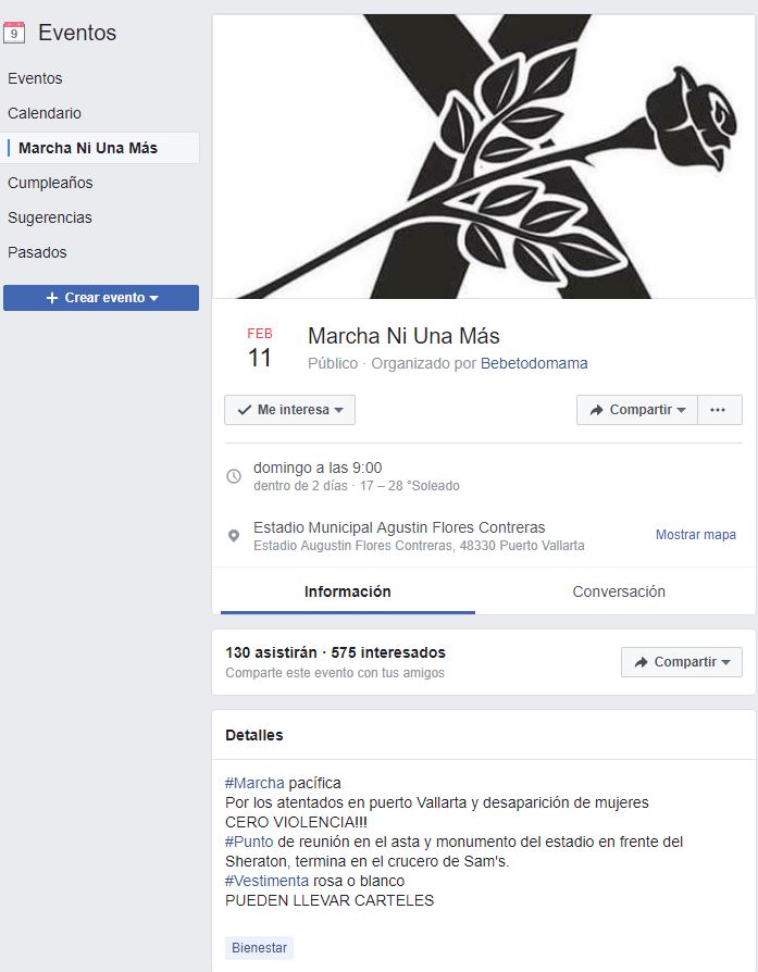 En la convocatoria, se describe que se trata de una marcha pacífica “Por los atentados en Puerto Vallarta y desaparición de mujeres. CERO VIOLENCIA!!!”
