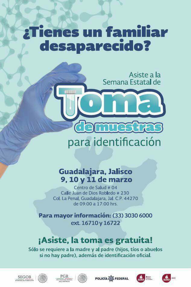 La Procuraduría General de la República (PGR), en coordinación con la División Científica de la Policía Federal (PF) y la Fiscalía General de Jalisco, puso en marcha la Semana Estatal de Toma de Muestras Genéticas para Identificación Humana en el estado.