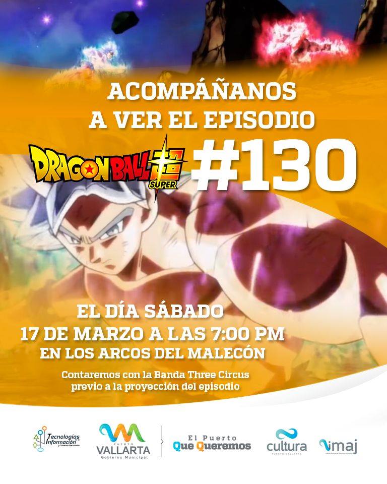 Así lo confirmó su director, Fernando Carrillo, en su perfil y minutos después, la propia cuenta del IMAJ lo escribió. “El Instituto Municipal de Atención a la Juventud en coordinación con el Gobierno Municipal y la Direccion de Cultura de Puerto Vallarta te invitan este sábado 17 de marzo a las 7pm en los Arcos del Malecón a ver el episodio #130 de Dragon Ball Super!