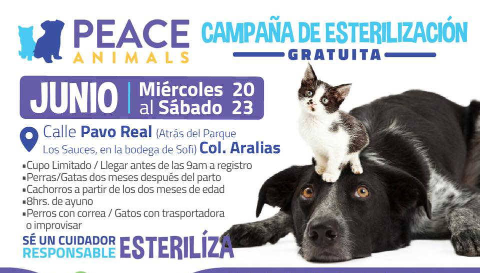 Desde el pasado miércoles y hasta este sábado, la asociación civil Peace Animals, en conjunto con el Centro de Control, Asistencia Animal y Albergue Municipal, realizan esterilizaciones a mascotas de forma gratuita, con la finalidad de erradicar la problemática de animales callejeros.