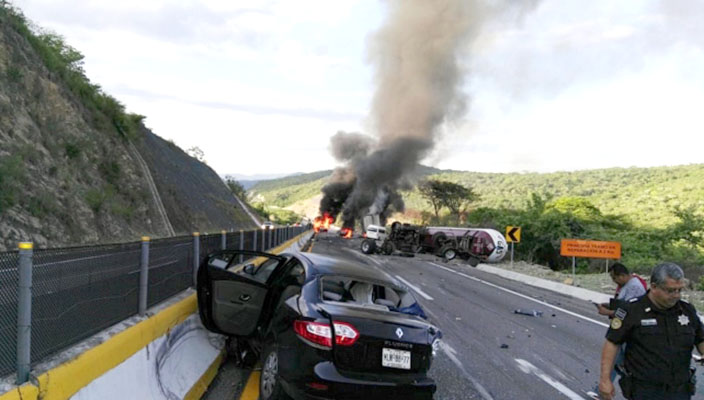 Un tráiler que se quedó sin frenos cuando circulaba por la Autopista del Sol, a la altura de Paso Morelos, en el estado de Guerrero, arrollando a nueve vehículos, entre ellos una pipa de Gas LP, con saldo de tres personas lesionadas y un automóvil incendiado.