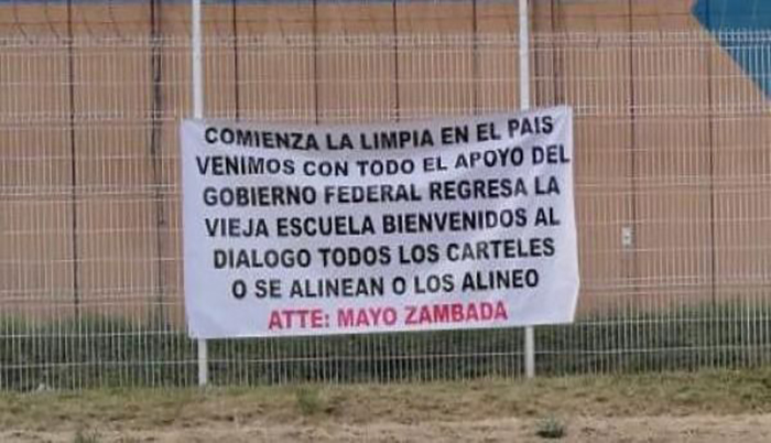 Las mantas impresas en lonas blancas con tipografía negra y roja contienen el mismo mensaje: “Comienza la limpieza en el país venimos con todo el apoyo del gobierno federal Regresa la vieja escuela bienvenidos al diálogo todos los carteles o se aliean o los alineo. Atte: Mayo Zambada”.