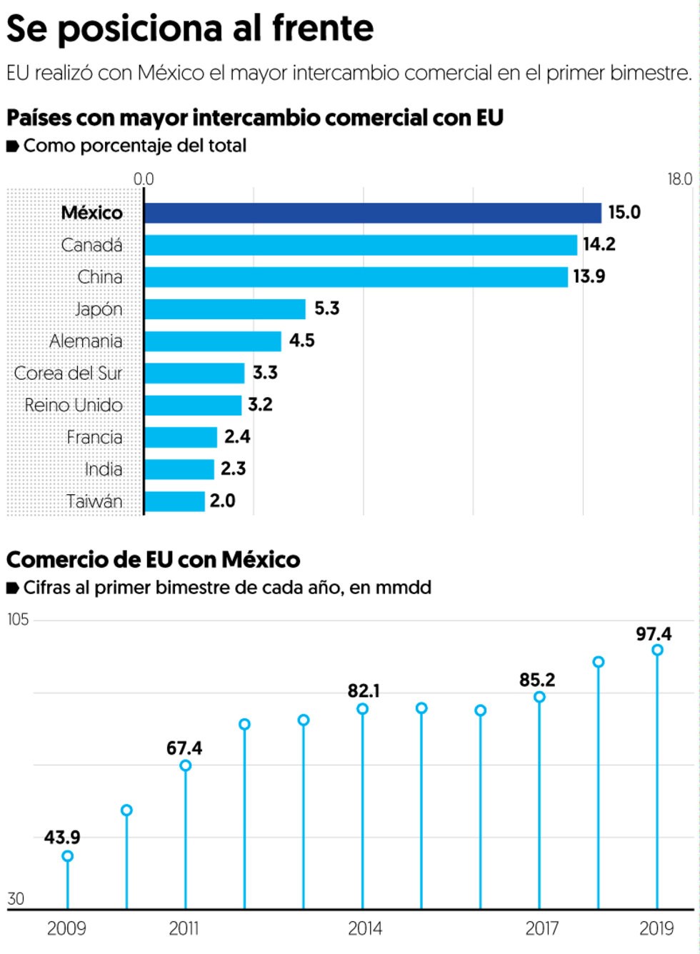 Durante el primer bimestre de 2019 México se ubicó por primera vez en la historia como el principal socio comercial de Estados Unidos. El valor de las exportaciones e importaciones entre ambos países ascendió a 97 mil 418 millones de dólares.