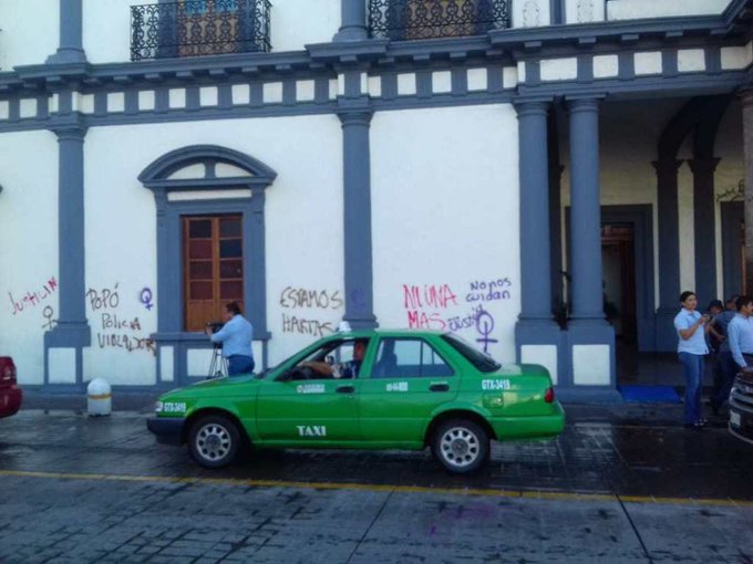 El grupo de mujeres que participó en una marcha “pacifica”, pintaron la fachada de Palacio de Gobierno, las letras que le dan color e historia a la ciudad de Tepic, así como el obelisco que se encuentran en la Plaza Bicentenario y otros sitios del centro histórico.