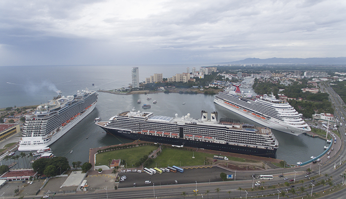 Este 1 de enero Puerto Vallarta tuvo el primer arribo triple de cruceros del 2020; en el Muelle 1, atracado el crucero Royal Princess con 3,966 pasajeros y 1,361 tripulantes, en el Muelle 2, atracado el crucero Oosterdam 2,218 pasajeros y 776 tripulantes, en el Muelle 3, el crucero Carnival Panorama con 4,931 pasajeros y 1,434 tripulantes.