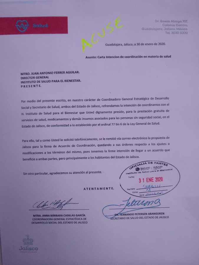 En la carta que dirige a Juan Antonio Ferrer Aguilar, director del Insabi, expresa “quedando a sus órdenes respecto a los ajustes o modificaciones a los términos del mismo, pues tenemos la firme intención de llegar a un acuerdo que beneficie a ambas partes, pero principalmente a los habitantes de JALISCO”.