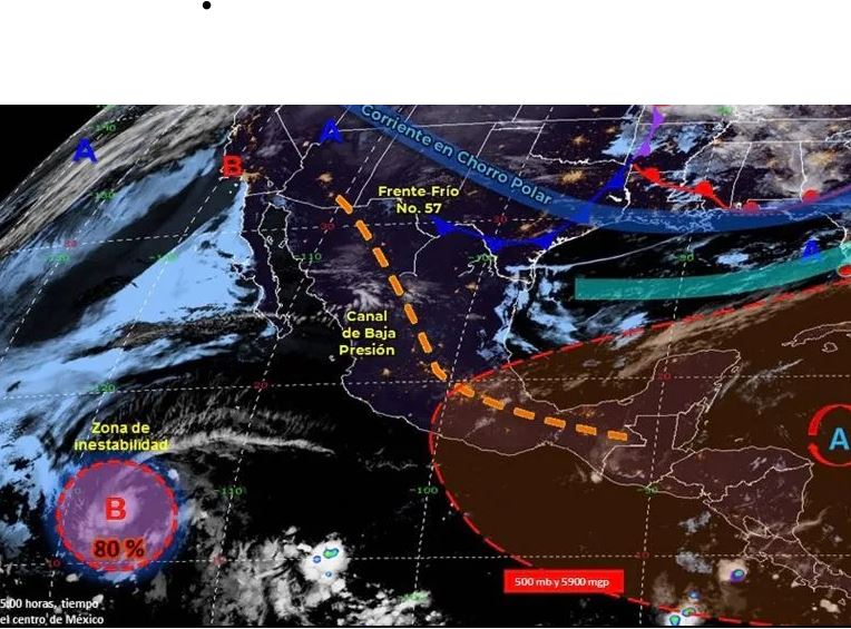 De acuerdo con el Servicio Meteorológico Nacional (SMN), por la tarde canales de baja presión sobre el centro del territorio nacional y en la Península de Yucatán, asociados con divergencia en altura, incrementarán la probabilidad de lluvias con descargas eléctricas, vientos fuertes y posible caída de granizo en el centro del país.