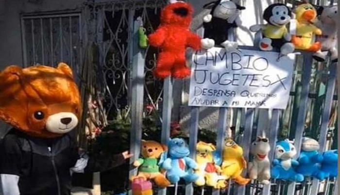 Ante la suspensión de actividades en empresas consideradas como no esenciales, la señora Yissel Ortiz Vega se quedó sin empleo, por lo que sus hijos Alexis e Itzel sacaron sus juguetes a la entrada de su casa y colocaron un anuncio en cartulina que a la letra decía: “Cambio juguetes por despensa, queremos ayudar a mi mamá”.