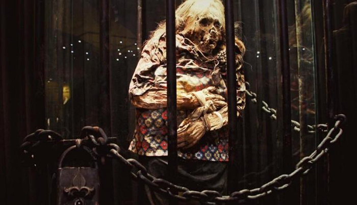Por primera vez en su historia, la ‘Momia Bruja’ exhibida en el Museo de las Momias de Guanajuato, será retirada de la jaula bendecida en la que permanece encerrada con cadenas y candados, además de estar rodeada de crucifijos, como se muestra en un video de Claroscuro Noticias.