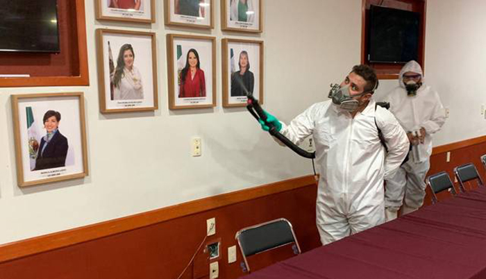 Aunado a ello, se procedió a la limpieza de las oficinas del Jurídico, Vinculación, Comunicación Social, espacios intermedios, patio principal, por personal de Servicios Generales del Congreso del Estado e inmediatamente entró la empresa privada contratada para que procediera a limpiar con ozono, informó la diputada Sofía García Mosqueda, presidenta de la Mesa Directiva que indicó que también se contrató un túnel de ozono por el que pagarán 29 mil pesos mensuales y estará por ahora de forma permanente. Por la limpieza con ozono el costo es de 45 mil pesos.
