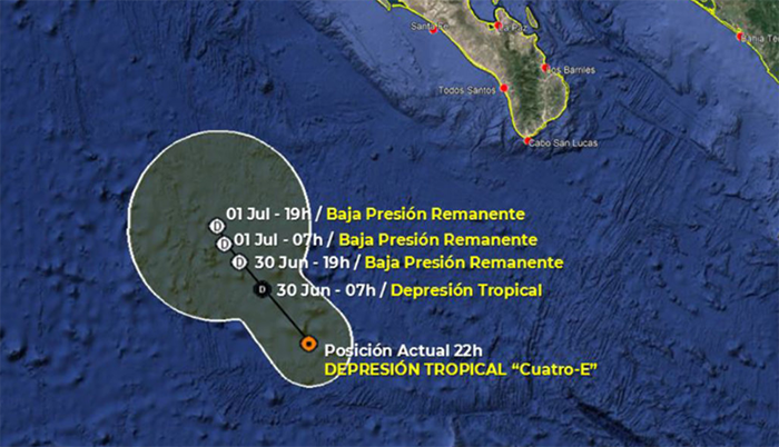 Autoridades de Baja California Sur mantienen la alerta ante la presencia de la Depresión Tropical 4-E en costas del Pacífico en donde se prevé que provoque lluvias, un canal de baja presión sobre el interior del país asociado con una línea seca sobre el norte de México y con el ingreso de aire cálido y húmedo del Océano Pacífico y Golfo de México.