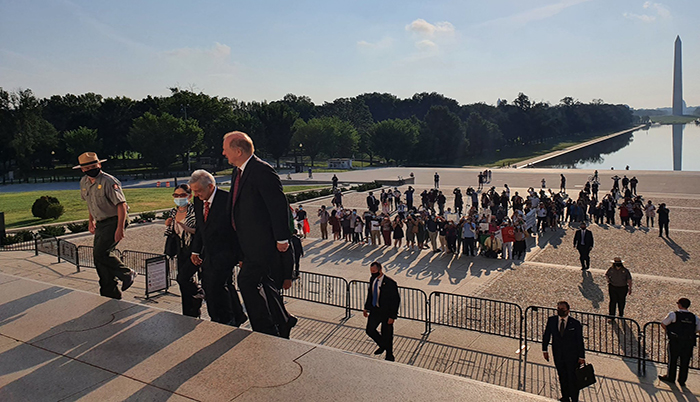 Tras visitar el monumento a Abraham Lincoln, el presidente Andrés Manuel López Obrador se trasladó a la estatua de Benito Juárez para rendir sus respectivos honores.