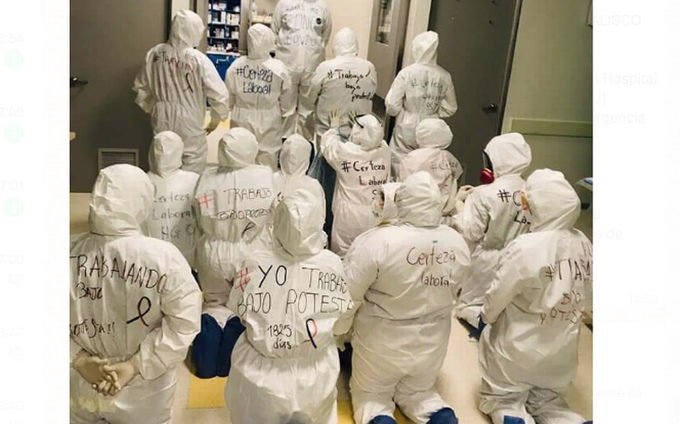 Personal eventual de salud del Hospital General de Occidente (HGO), de la Secretaría de Salud Jalisco (SSJ) trabajan bajo protesta, denuncian que enfrentan, además de la emergencia sanitaria por Covid-19 condiciones laborales desfavorables.