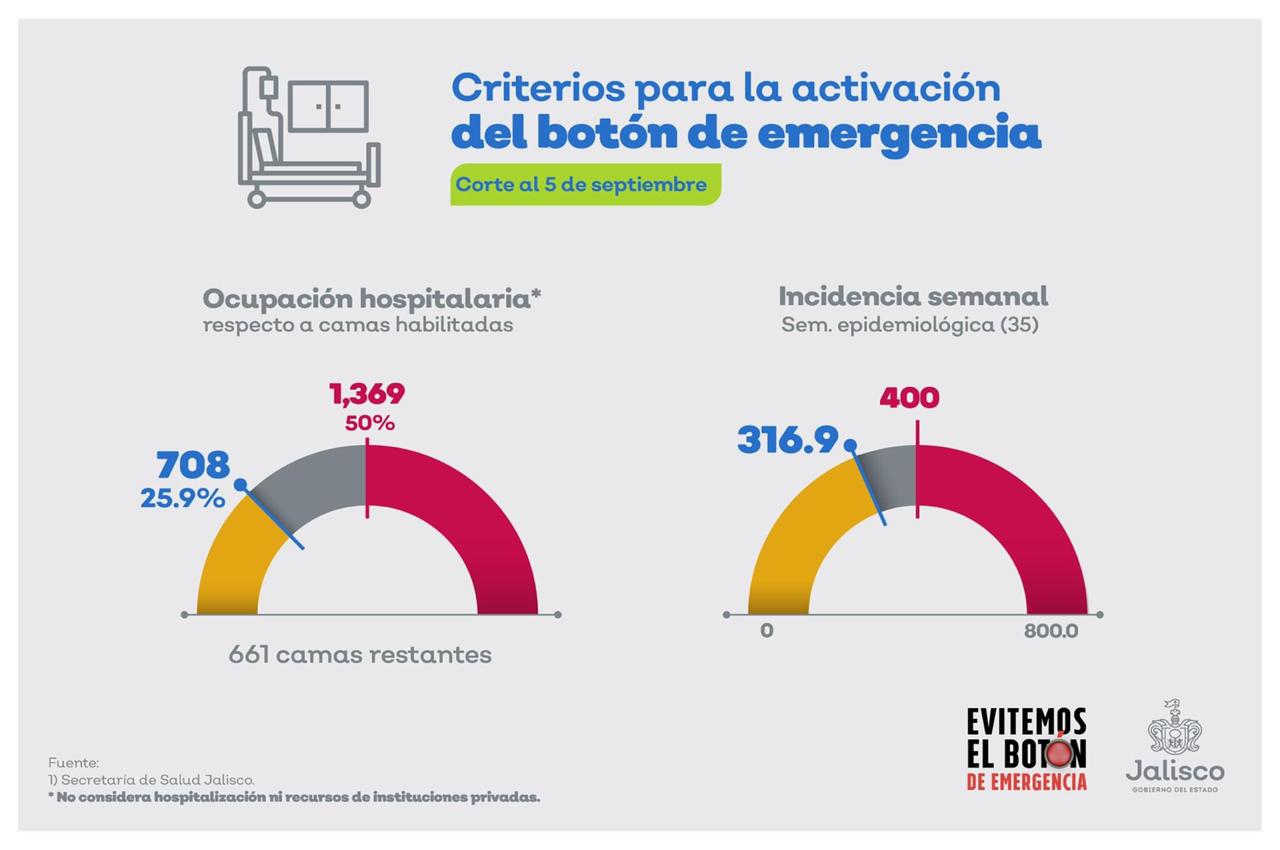 “Gracias a la responsabilidad individual de las y los jaliscienses, los indicadores Jalisco #COVID19 son mejores que la semana anterior: del 26.1 % de ocupación hospitalaria bajamos al 25.9 %, y de una incidencia de 326.2 pasamos a 316.9 casos estimados por millón de habitantes”. Indicó Alfaro Ramírez