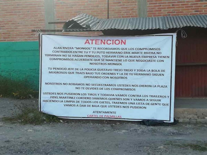 La manta contenía mensajes en contra del candidato del PAN a alcalde de Zimapán, Alan Rivera Villanueva, y se atribuyó al Cártel de Palmillas.