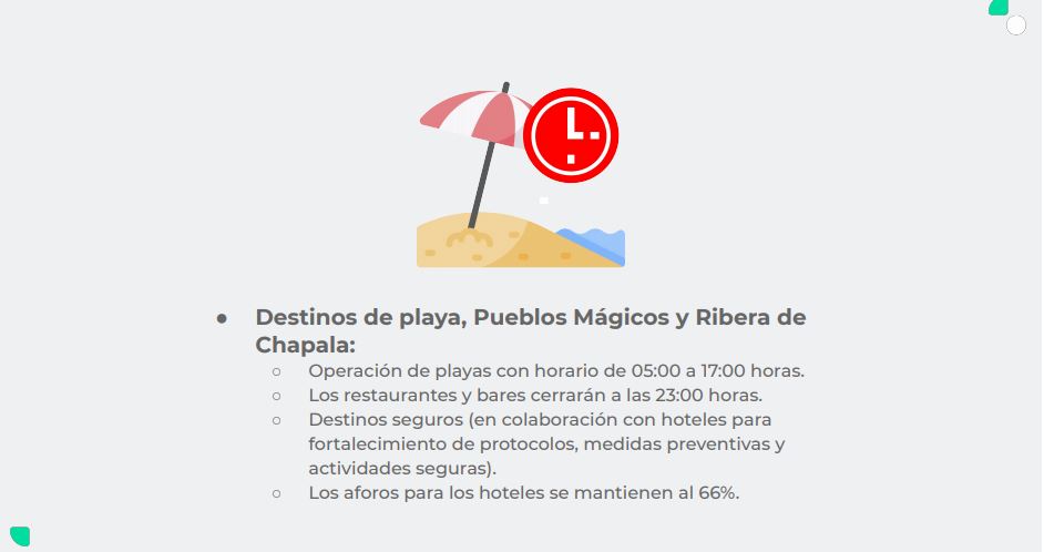 De acuerdo a la presentación, las playas, bares, antros y eventos multitudinarios estarán limitados y prohibidos.