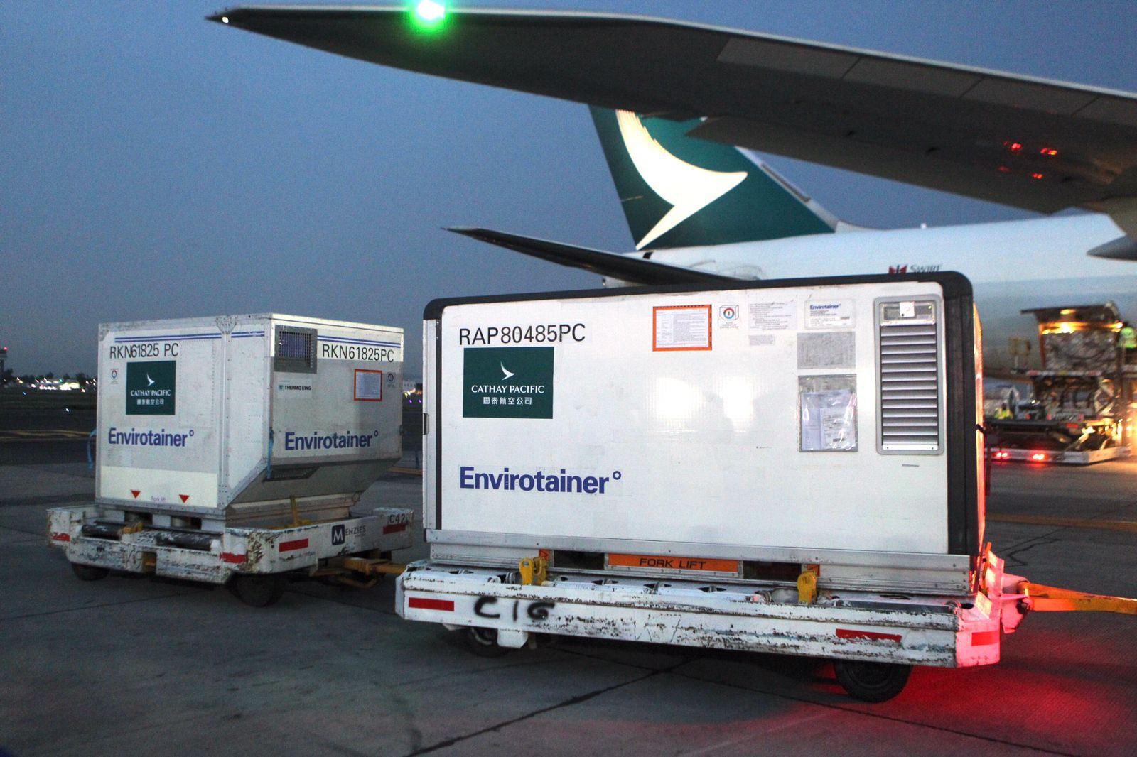 Las dosis contra la enfermedad de COVID-19 llegaron al Aeropuerto Internacional de la Ciudad de México (AICM) en el vuelo CX86, proveniente de Anchorage, Alaska; los 290 mil biológicos serán envasados en el laboratorio Drugmex, con sede en Querétaro.
