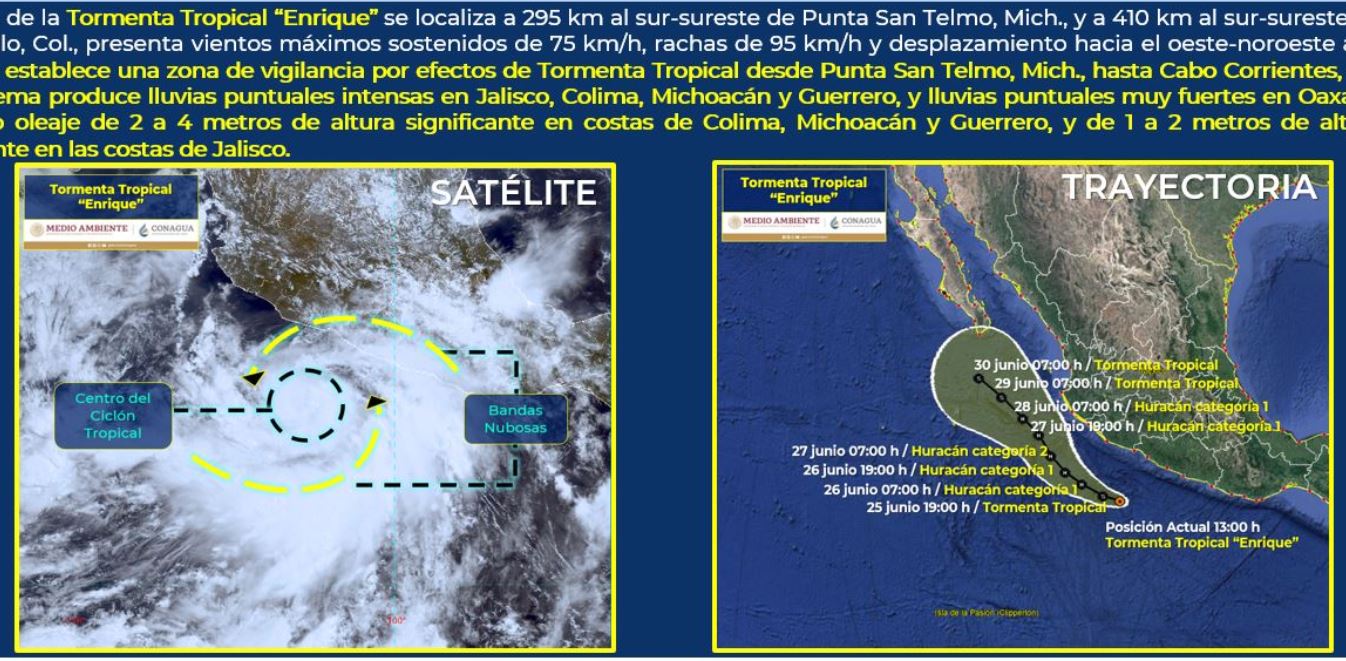 La trayectoria de “Enrique” hasta este momento no representa impacto directo para las costas de Jalisco, sin embargo se prevé que su paso frente a las costas del Estado la madrugada del domingo 27 de junio, provoquen lluvias de moderadas a fuertes sobre todo en la zonas serranas como lo son la Sierra Occidental y Sierra de Amula, además de las Costas Sur y Norte.