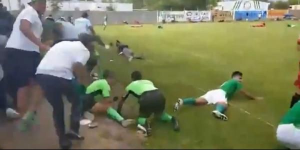 A través de un video difundido en redes sociales se aprecia el momento en que se lleva a cabo el partido de futbol y segundos después se escuchan varias detonaciones con armas de fuego lo que provoca que los jugadores y asistentes se tiren al suelo mientras estos gritan “¡Al suelo! ¡al suelo! Tírense”.