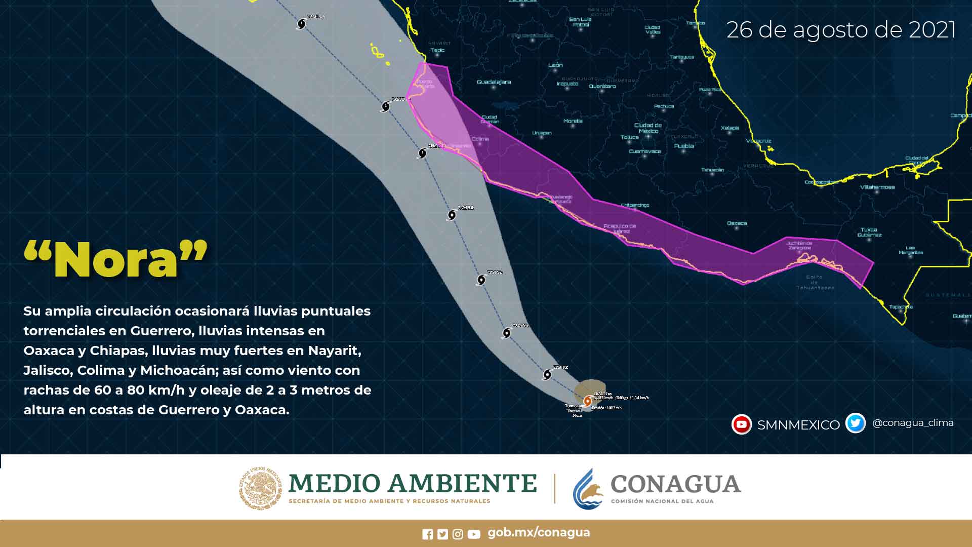 Debido a su amplia circulación, ”Nora” dejará lluvias torrenciales en las próximas horas en áreas de Guerrero, así como intensas en Chiapas y Oaxaca, y muy fuertes en regiones de Colima, Michoacán, Nayarit y Jalisco.