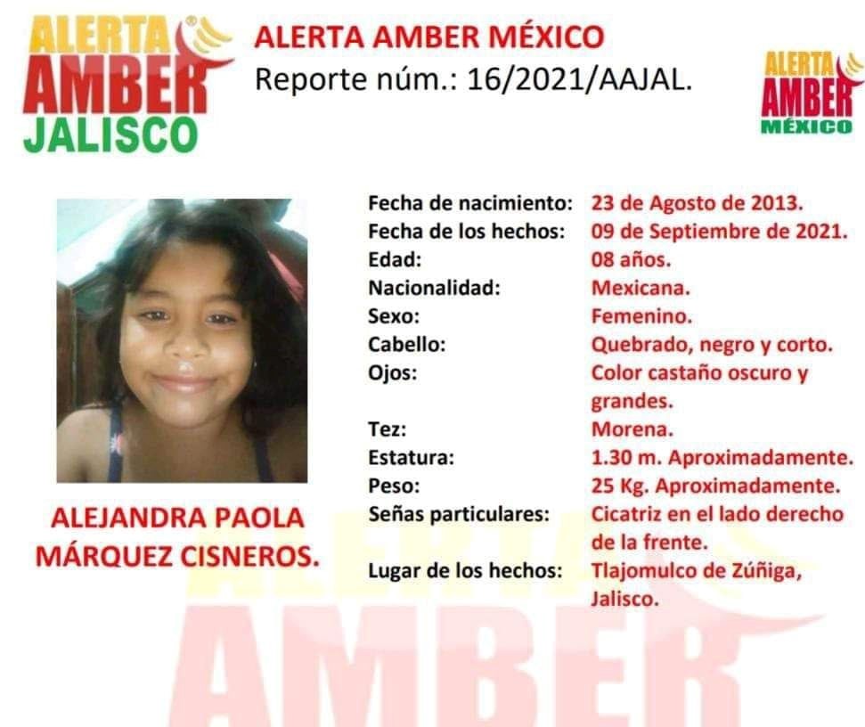La menor de nombre Alejandra Paola de tan solo 8 años de edad desapareció la tarde de ayer en Colinas del Roble en Tlajomulco de Zúñiga. Hoy fue encontrada con vida en compañía de otros dos menores.