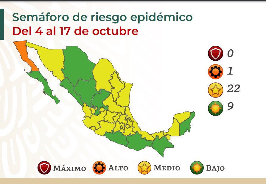 En la actualización de este viernes 1 de octubre, Jalisco y Nayarit continuaron en color amarillo, que representa ‘riesgo medio’, mientras que, a nivel nacional, solo hay un estado en color naranja, 22 en amarillo, 9 en verde y ningún estado se encuentra en color rojo.
