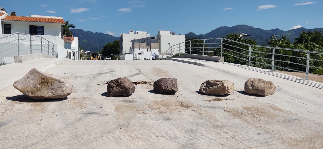 La molestia generó un bloqueo en el puente, con rocas enormes colocadas para impedir el paso, y 2 vehículos atravesados para llamar la atención de las autoridades.