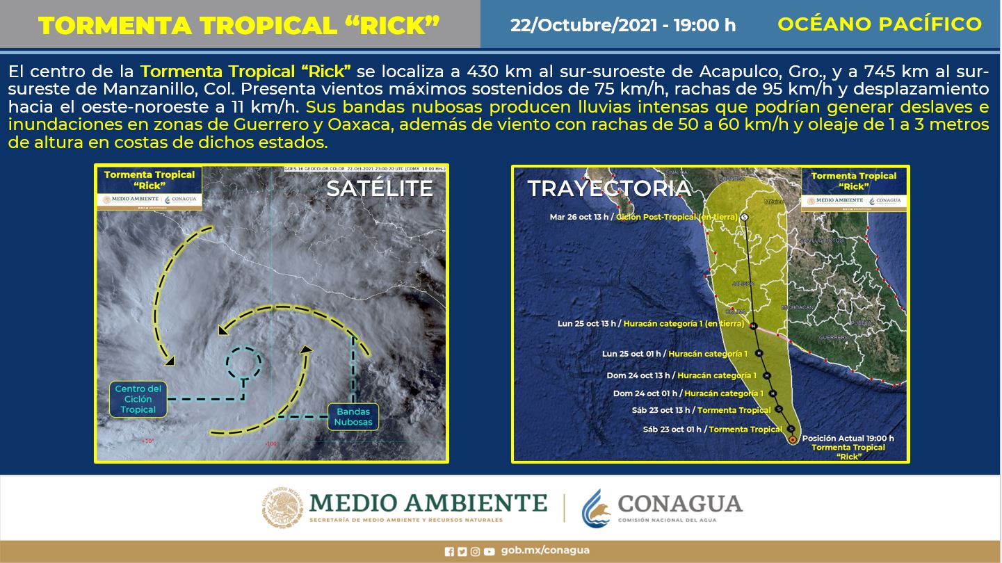 La tormenta tropical Rick se desarrolló la tarde del viernes 22 de octubre, a partir de la depresión tropical Diecisiete-E, frente a las costas del estado mexicano de Guerrero, en el océano Pacífico, y para el domingo podría llegar a huracán categoría 1, informó el Servicio Meteorológico Nacional (SMN).