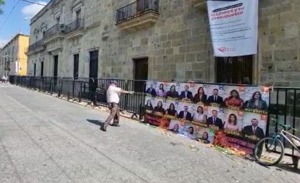 19 diputados, del MC, PRI, PAN y Verde en Jalisco, aprobaron las modificaciones al programa, en lugar de cancelarlo; manifestantes arrojaron huevos contra sus rostros en una lona.