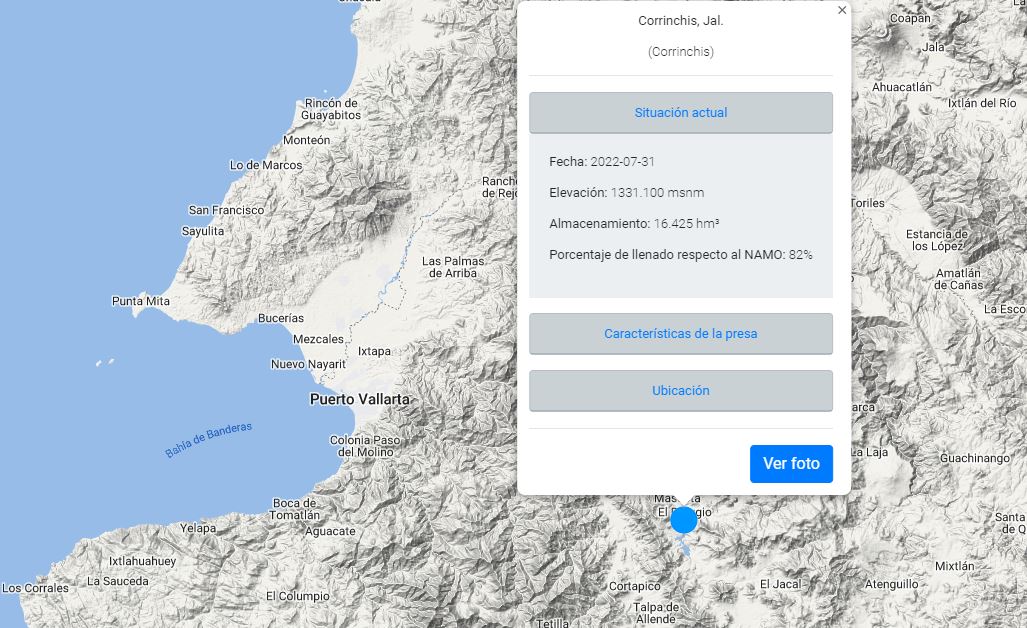 La presa Corrinchis, ubicada en Mascota, y que alimenta varios ríos que llegan hasta Puerto Vallarta, se encuentra al 82%, con 16,425 hectómetros cúbicos de agua, es decir, aumentó 10% su nivel en solo una semana.