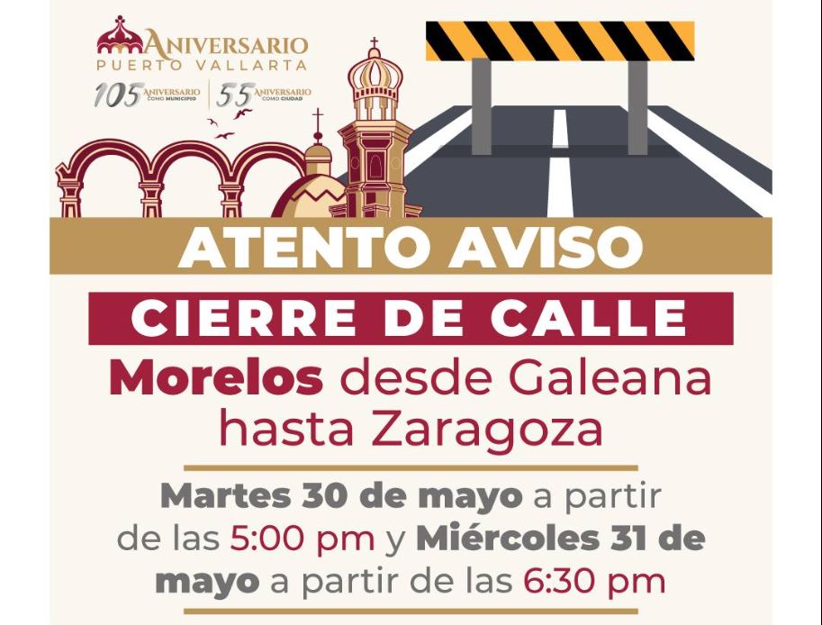 Por medio de una publicación en sus redes sociales, el Gobierno Municipal de Puerto Vallarta anunció que se cerrará la calle Morelos desde Galeana hasta Zaragoza los días 30 y 31 de mayo con motivo de las festividades del aniversario de Puerto Vallarta.