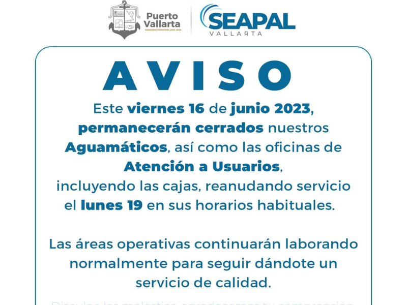 Por medio de un posteo en sus redes sociales, el Sistema de Servicios de Agua Potable, Drenaje y Alcantarillado de Puerto Vallarta (SEAPAL) informó que permanecerán cerrados sus aguamáticos, así como las oficinas de atención a usuarios, incluyendo las cajas, durante el viernes 16 de junio. Reanudarán sus actividades en tres días.