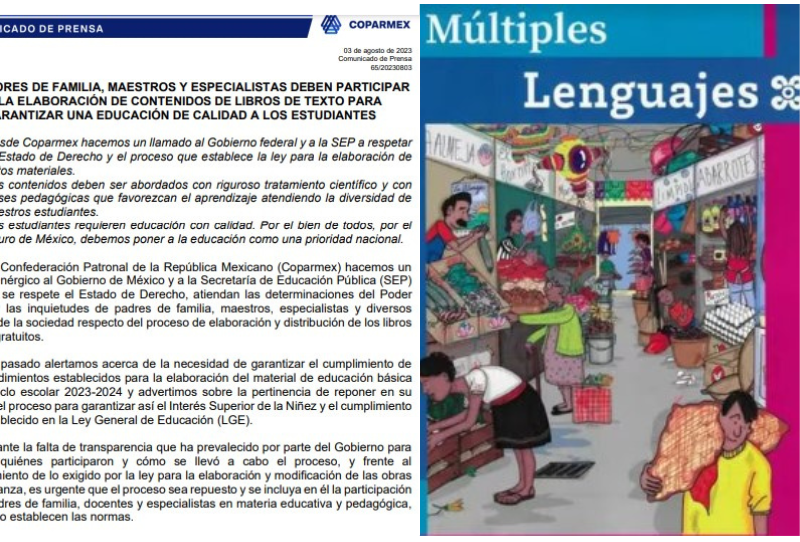 La Confederación Patronal de la República Mexicano (Coparmex) hizo un llamado al Gobierno federal y a la SEP a respetar el Estado de Derecho y el proceso que establece la ley para la elaboración de los materiales.