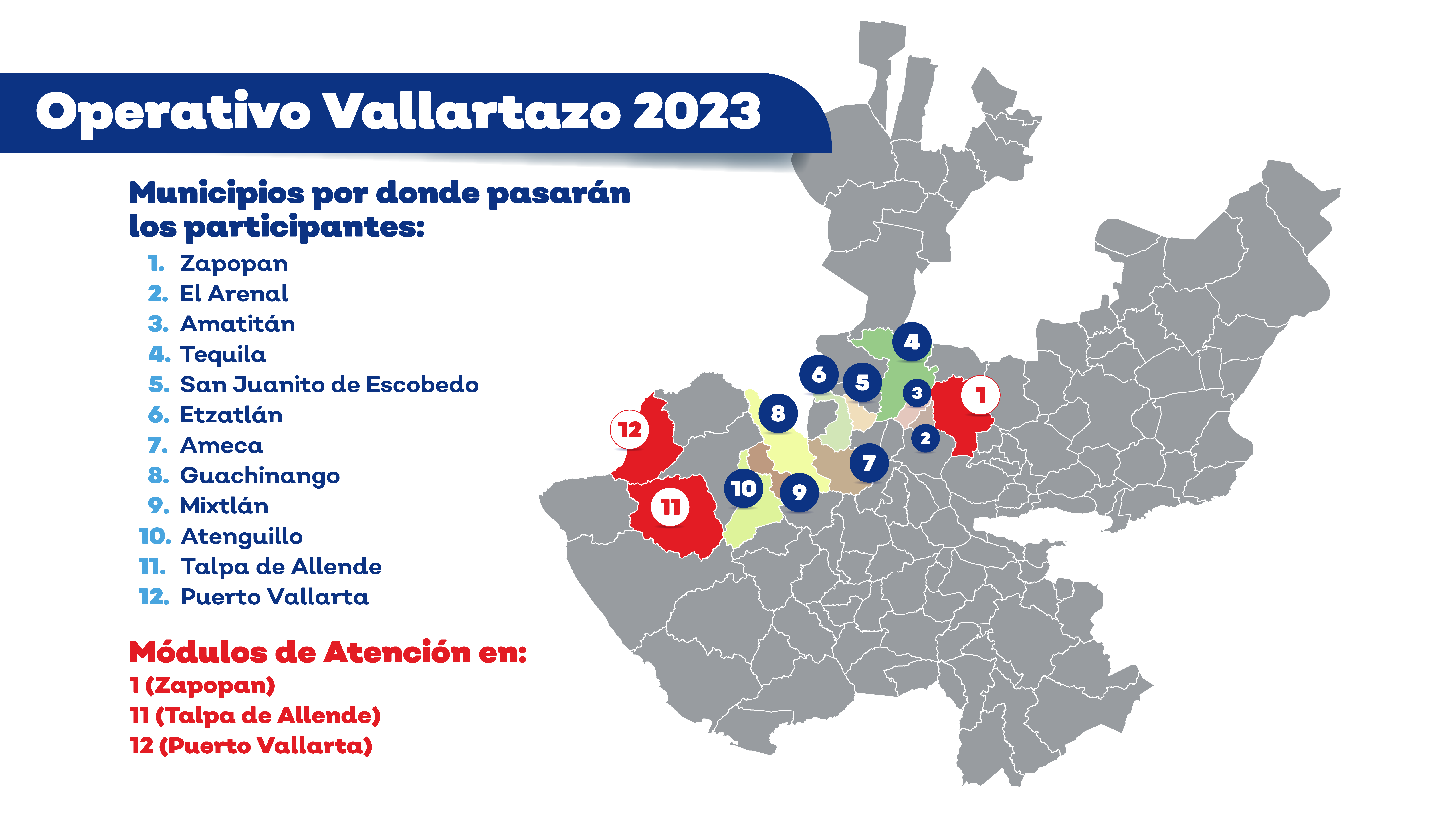 Este operativo comprenderá la supervisión en distintos tramos del trayecto que realizarán los participantes, así como el establecimiento de tres módulos de atención, los cuales estarán ubicados en los municipios de Zapopan, Talpa de Allende y Puerto Vallarta.