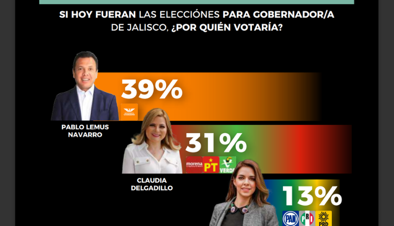 Según la encuesta de GobernArte de enero, el precandidato de Movimiento Ciudadano, Pablo Lemus, lidera la contienda por la gubernatura de Jalisco con un 39.0% de preferencias, ocho puntos porcentuales por encima de Claudia Delgadillo.