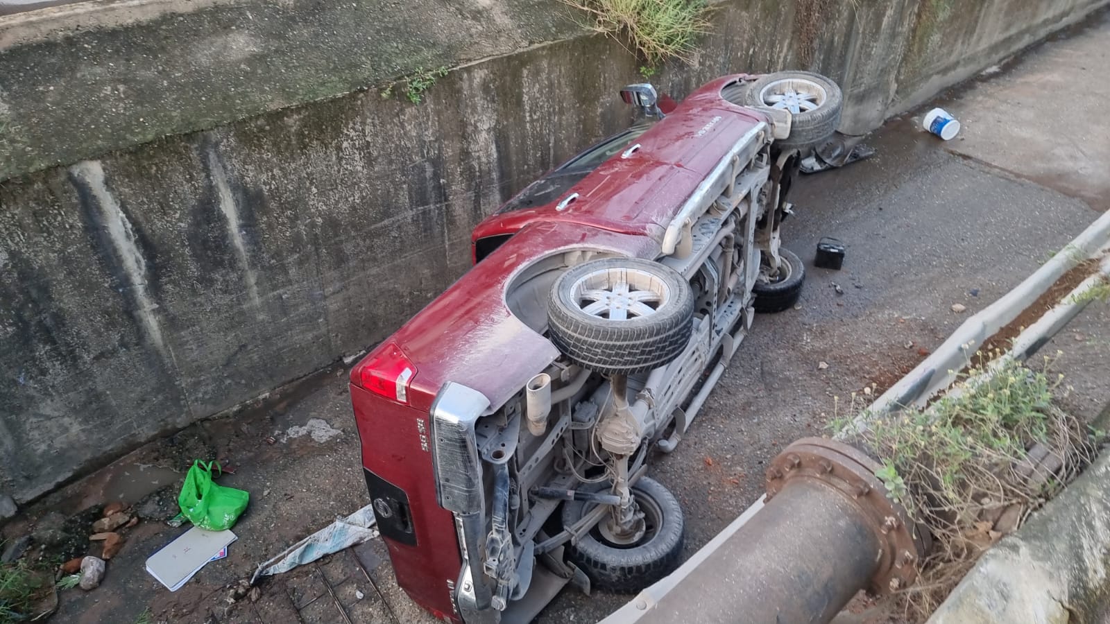 Un aparatoso accidente de tránsito se registró en el cruce de Avenida de los Poetas y Calle Exiquio Corona, en la colonia Hipódromo de Puerto Vallarta, donde una camioneta Nissan Titan V8 color roja terminó volcada dentro de un canal adyacente.
