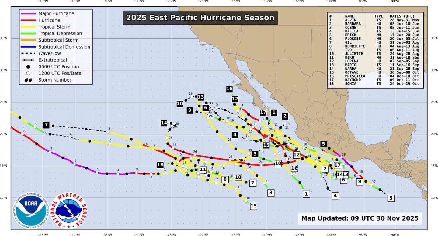 La Dirección de Protección Civil dio a conocer que la temporada de ciclones tropicales en el Pacífico Mexicano finalizó el pasado 30 de noviembre, con un total de 18 sistemas formados, de los cuales 10 llegaron a huracán y 8 fueron tormentas tropicales. Durante este periodo, Puerto Vallarta mantuvo vigilancia constante por los posibles efectos de los ciclones Priscilla y Raymond.