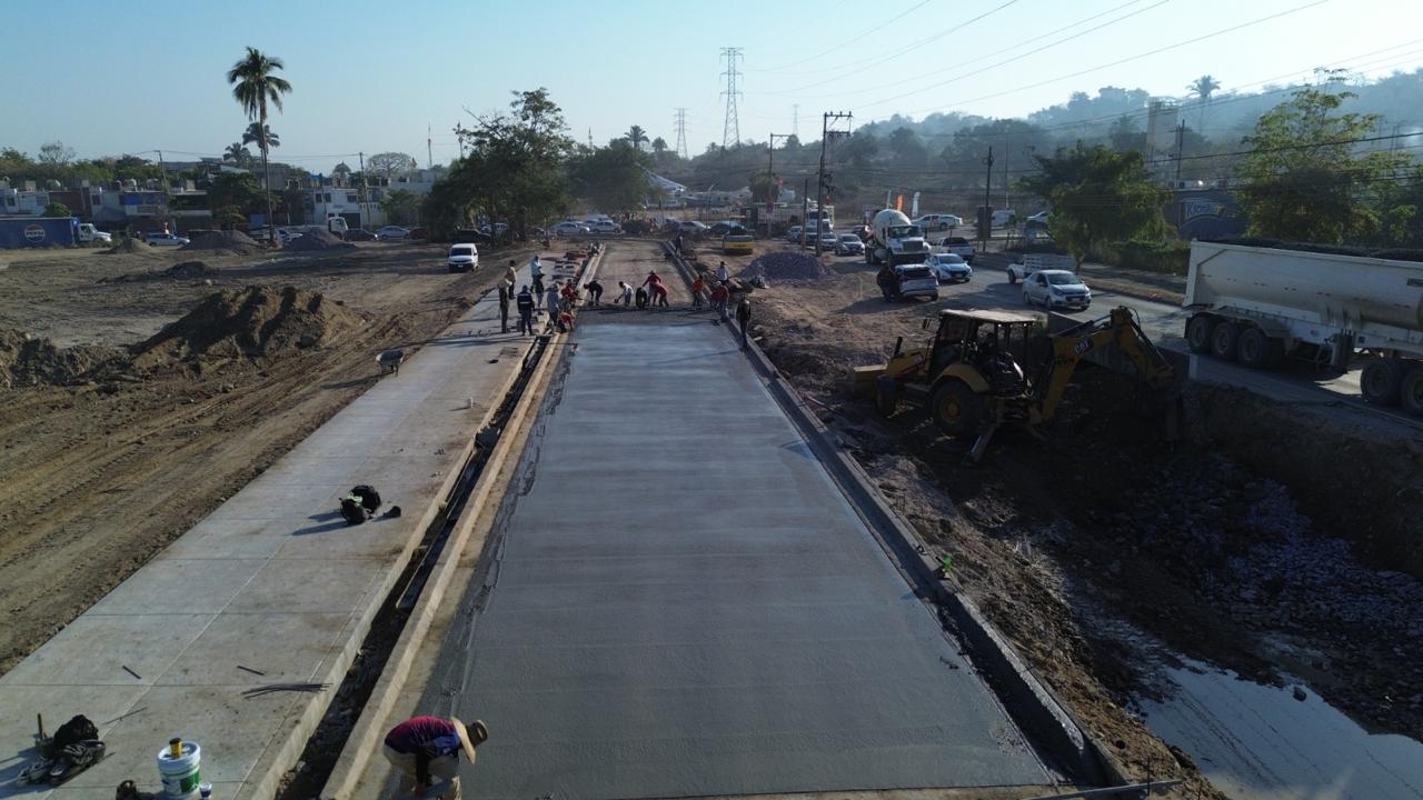 Actualmente, las labores se enfocan en la construcción de la superficie de rodamiento, así como en el colado del canal central, infraestructura clave para el manejo de aguas pluviales y la correcta operación de la vialidad.