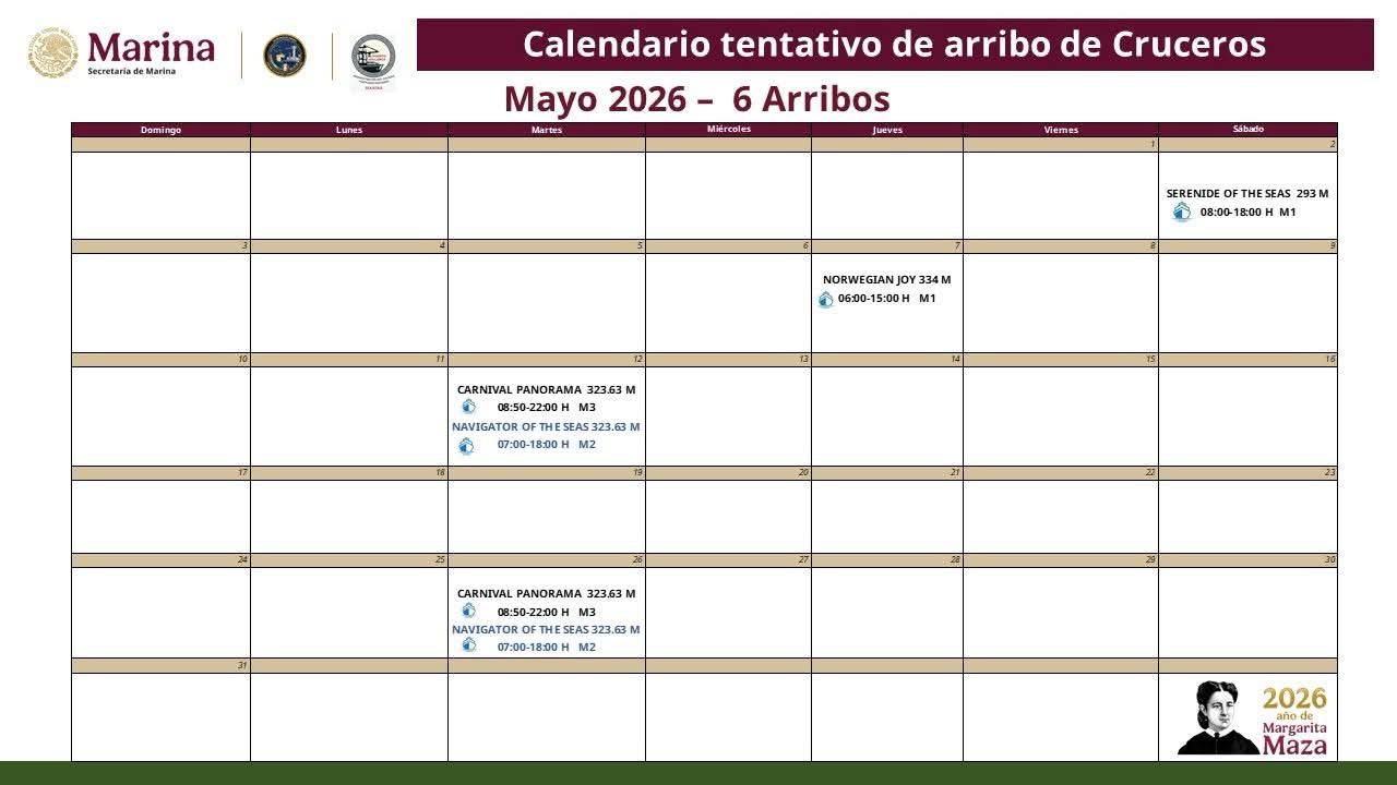 El 12 de mayo será uno de los días con mayor actividad, ya que se espera la llegada simultánea del Carnival Panorama y el Navigator of the Seas. Esta misma dinámica se repetirá el 26 de mayo, cuando ambos cruceros volverán a coincidir en el puerto.